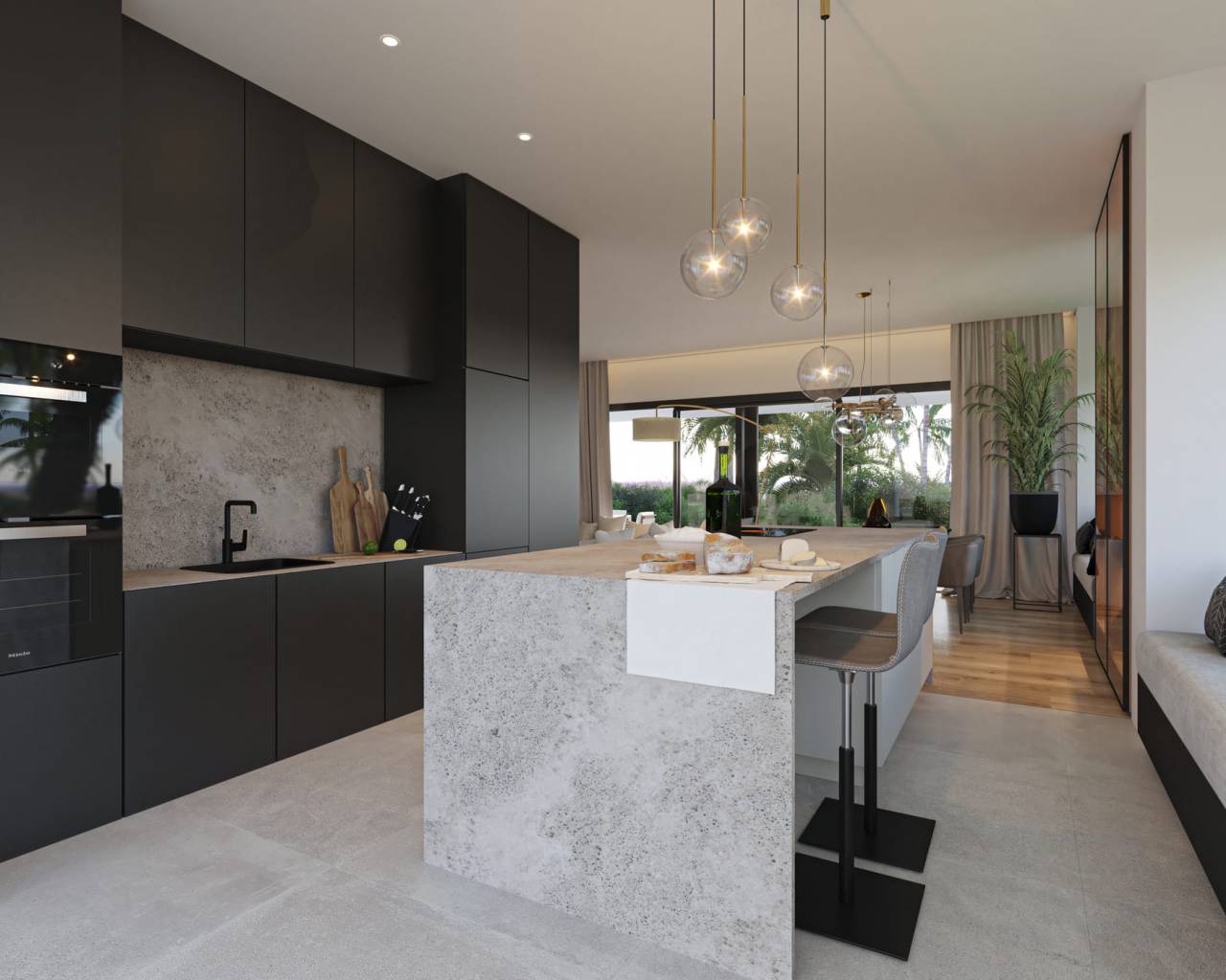 El interior de las viviendas está diseñado para ofrecer el máximo confort y funcionalidad. Los apartamentos y opciones en planta baja están disponibles con dos o tres dormitorios y dos o tres baños, adaptándose a las necesidades de diferentes tipos de familias. Las viviendas están completamente amuebladas y cuentan con electrodomésticos modernos, suelos de madera que aportan calidez, persianas eléctricas para mayor comodidad y armarios empotrados que optimizan el espacio de almacenamiento. Además, la preinstalación de aire acondicionado asegura un ambiente agradable durante todo el año.