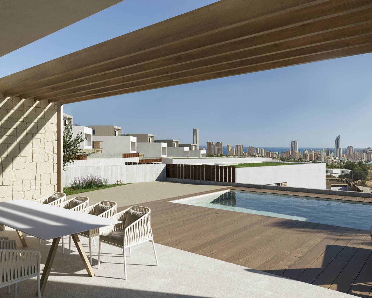El diseño exterior de las villas en Finestrat está pensado para maximizar el disfrute del entorno natural. Cada villa cuenta con un jardín privado, perfecto para disfrutar del aire libre y del clima mediterráneo. Las terrazas amplias ofrecen un espacio ideal para relajarse y contemplar las impresionantes vistas al mar. Además, las villas están equipadas con pérgolas que proporcionan sombra y un toque estético adicional al espacio exterior. La presencia de un garaje asegura comodidad y seguridad para los vehículos de los residentes.