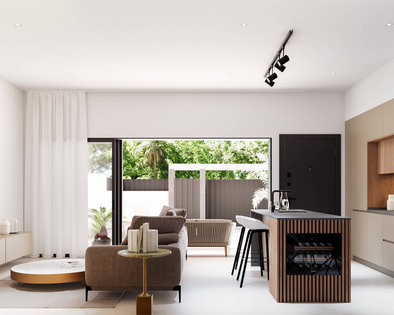 El interior de las viviendas está diseñado para ofrecer comodidad y estilo. Los suelos de gres porcelánico aportan un toque moderno y elegante a cada espacio. Las propiedades están equipadas con electrodomésticos de alta calidad y cuentan con aire acondicionado, asegurando un ambiente confortable durante todo el año. Las persianas eléctricas y los armarios empotrados son características estándar que añaden funcionalidad y conveniencia. Además, la preinstalación de aire acondicionado permite una personalización adicional según las necesidades del propietario. Las opciones de distribución incluyen viviendas de 2 y 3 dormitorios, así como 2 o 3 baños, adaptándose a diferentes estilos de vida y preferencias.