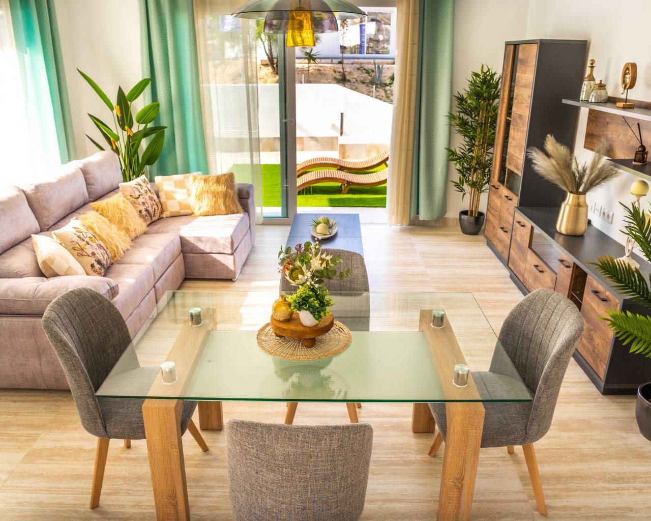 Los exteriores de estos adosados están pensados para maximizar el disfrute del clima mediterráneo. Cada propiedad cuenta con un jardín privado, ideal para crear un espacio verde personal o para disfrutar de momentos al aire libre. Además, los residentes pueden disfrutar de una piscina privada, perfecta para refrescarse durante los cálidos días de verano. Las terrazas ofrecen un espacio adicional para relajarse o para organizar reuniones al aire libre. Para aquellos que buscan vistas panorámicas, existe la opción de un solárium, proporcionando un lugar elevado para disfrutar del sol y las vistas de la zona.