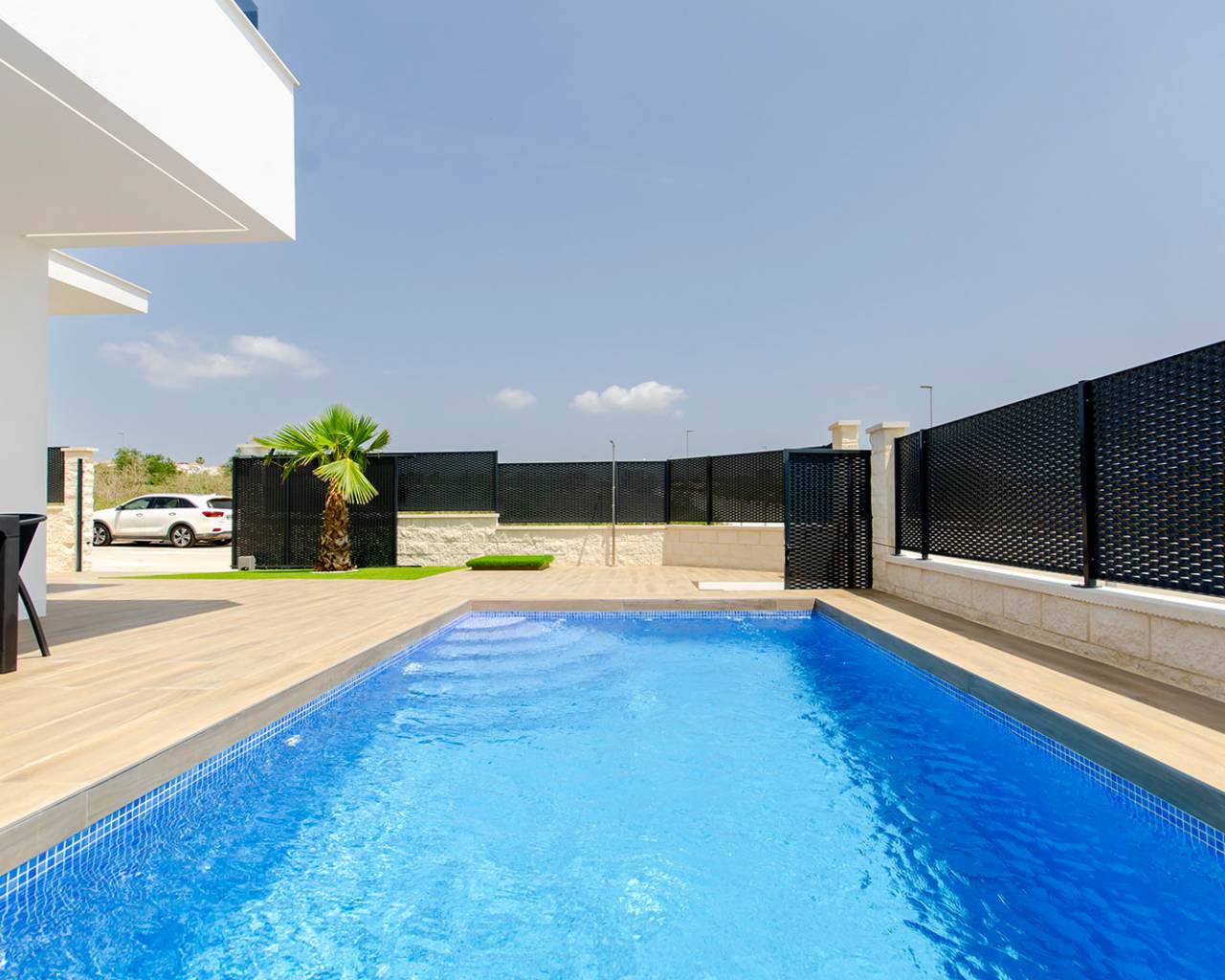Los exteriores de estas viviendas independientes en Orihuela están diseñados para maximizar el disfrute del entorno. Cada propiedad cuenta con un jardín privado, ideal para crear un oasis personal de tranquilidad. Las terrazas ofrecen un espacio adicional para relajarse o entretener a los invitados, mientras que la opción de un solárium permite disfrutar de vistas panorámicas y del sol durante todo el año. Además, cada vivienda dispone de una piscina privada, perfecta para refrescarse en los días calurosos. La inclusión de una pérgola añade un toque de elegancia y funcionalidad, proporcionando sombra y estilo a los espacios al aire libre.