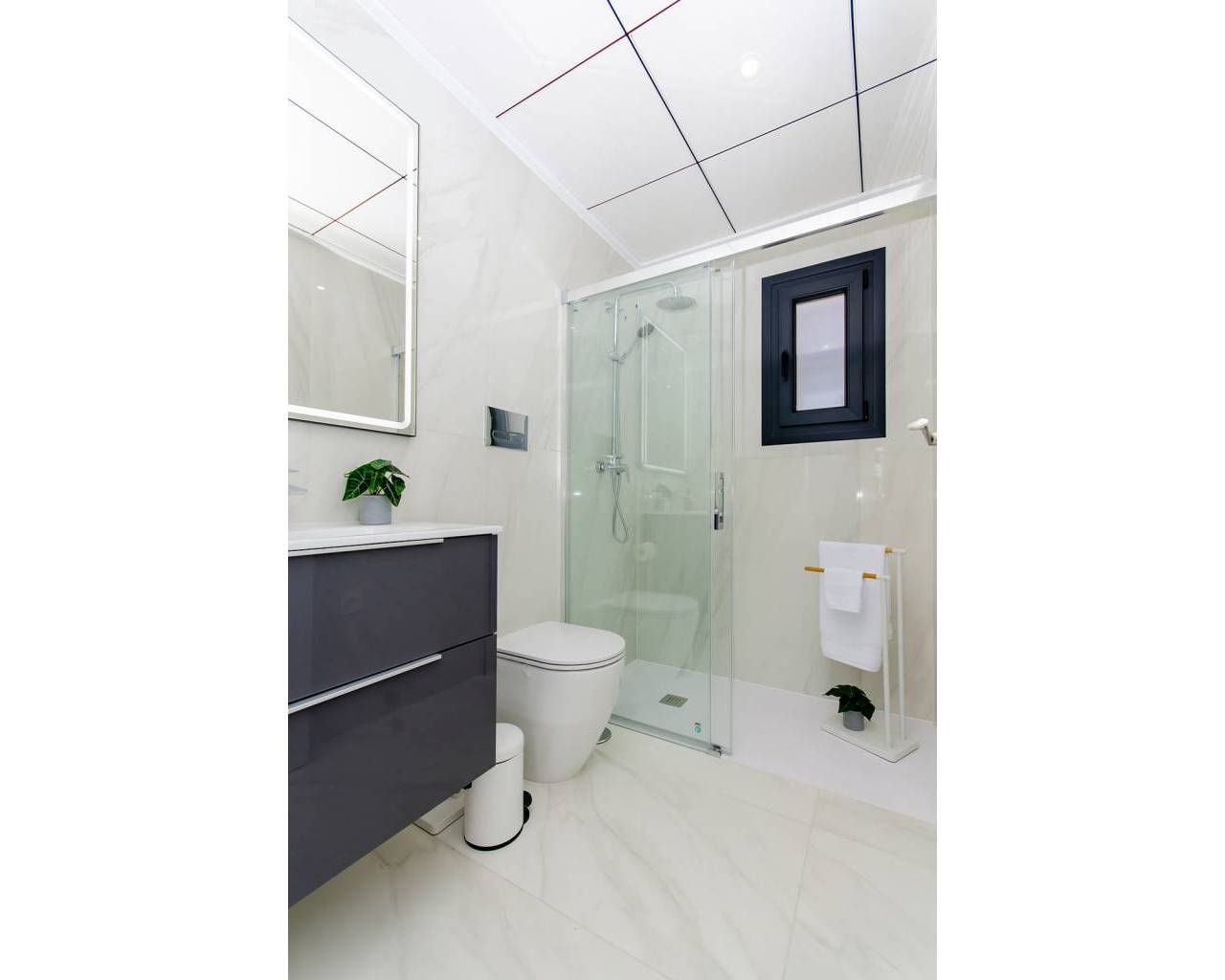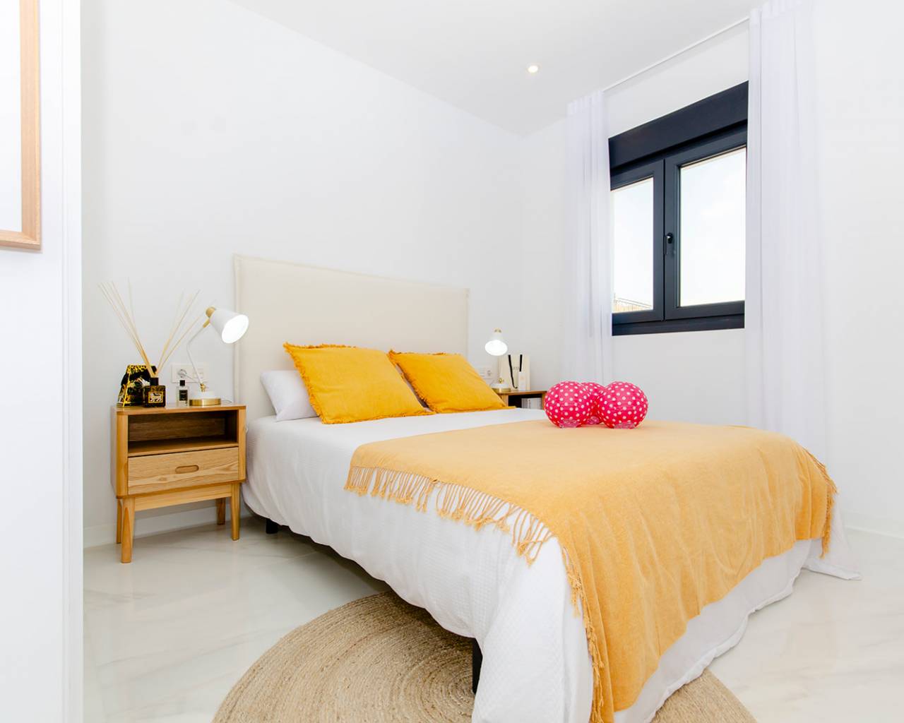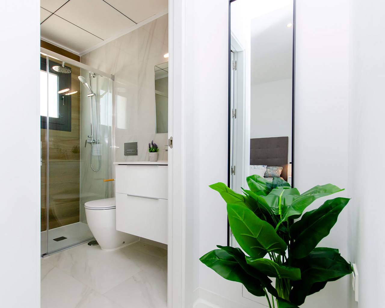 El interior de estas viviendas en Orihuela está diseñado con un enfoque en la comodidad y la funcionalidad. Los suelos de cerámica aportan un toque moderno y son fáciles de mantener. Las viviendas vienen completamente amuebladas, lo que facilita la mudanza y permite disfrutar del nuevo hogar desde el primer día. La cocina está equipada con electrodomésticos de alta calidad, y los armarios empotrados en los dormitorios ofrecen un amplio espacio de almacenamiento. El sistema de aire acondicionado, junto con la preinstalación adicional, asegura un ambiente agradable durante todo el año. Las persianas eléctricas y el videoportero añaden un nivel extra de confort y seguridad.