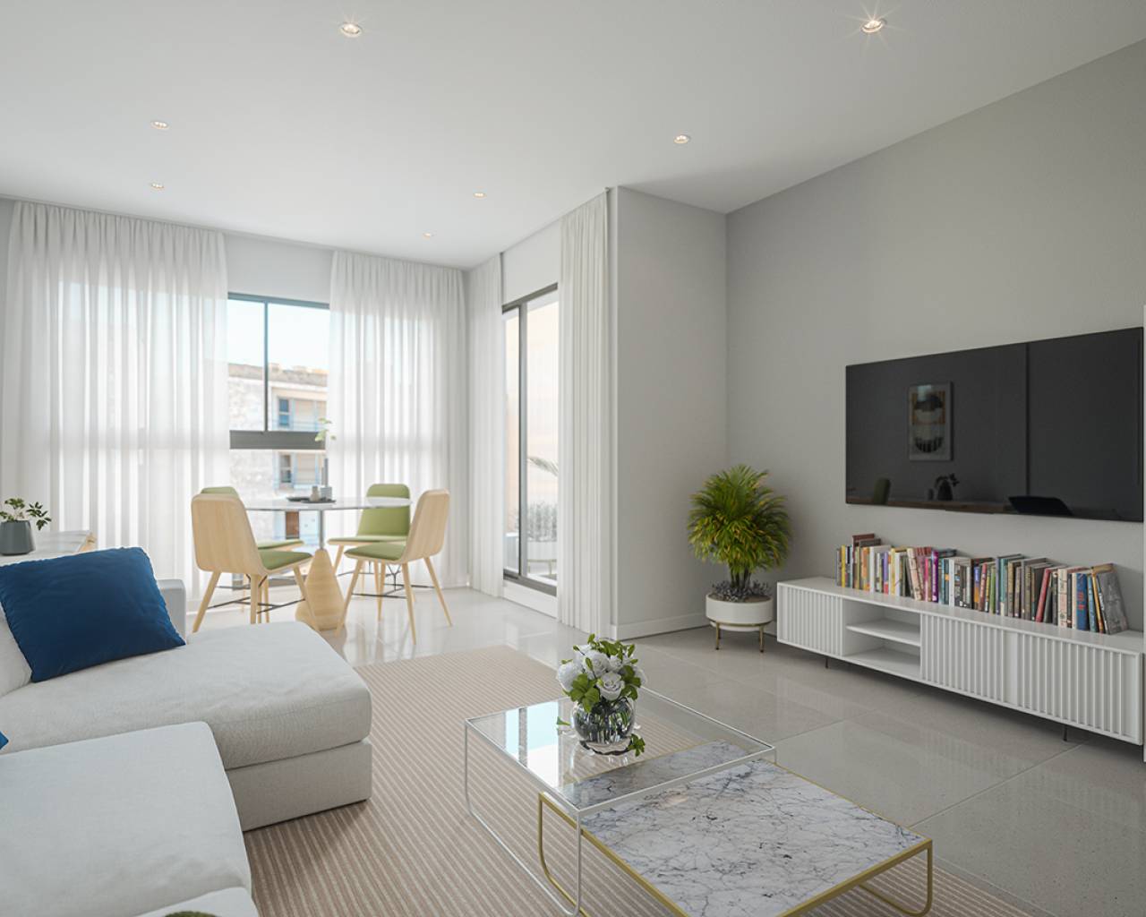 El interior de las viviendas está diseñado para ofrecer confort y elegancia. Con opciones de 2 o 3 dormitorios y 2 baños, cada propiedad está pensada para adaptarse a diferentes necesidades familiares. Los suelos de cerámica aportan un toque contemporáneo y son fáciles de mantener, mientras que los armarios empotrados ofrecen un almacenamiento eficiente. La inclusión de electrodomésticos modernos asegura que cada cocina esté lista para su uso desde el primer día. Las distribuciones están cuidadosamente planificadas para maximizar el espacio y la luz natural, creando ambientes acogedores y funcionales.